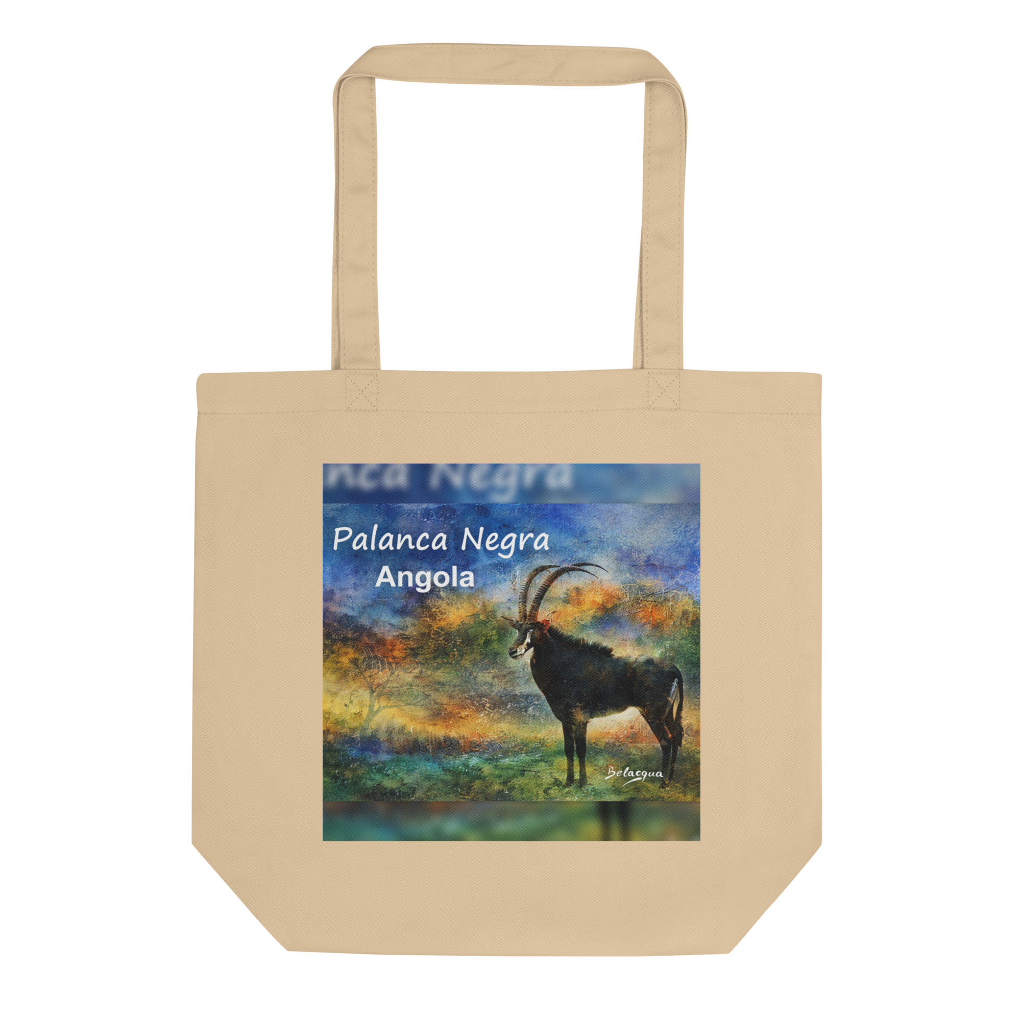 Carry a symbol of Angola with you. The Palanca Negra is one of the most iconic images of Angolan natural heritage, reinterpreted here through the artistic vision of Belacqua. This eco tote bag combines everyday function with cultural identity, turning an essential accessory into a wearable piece of art.