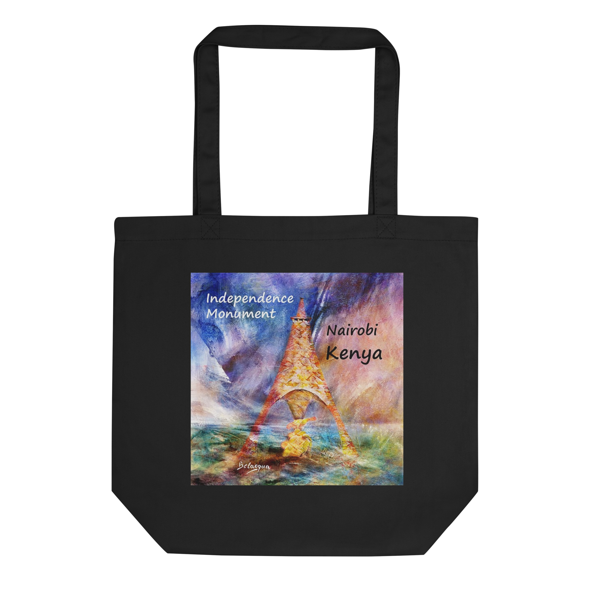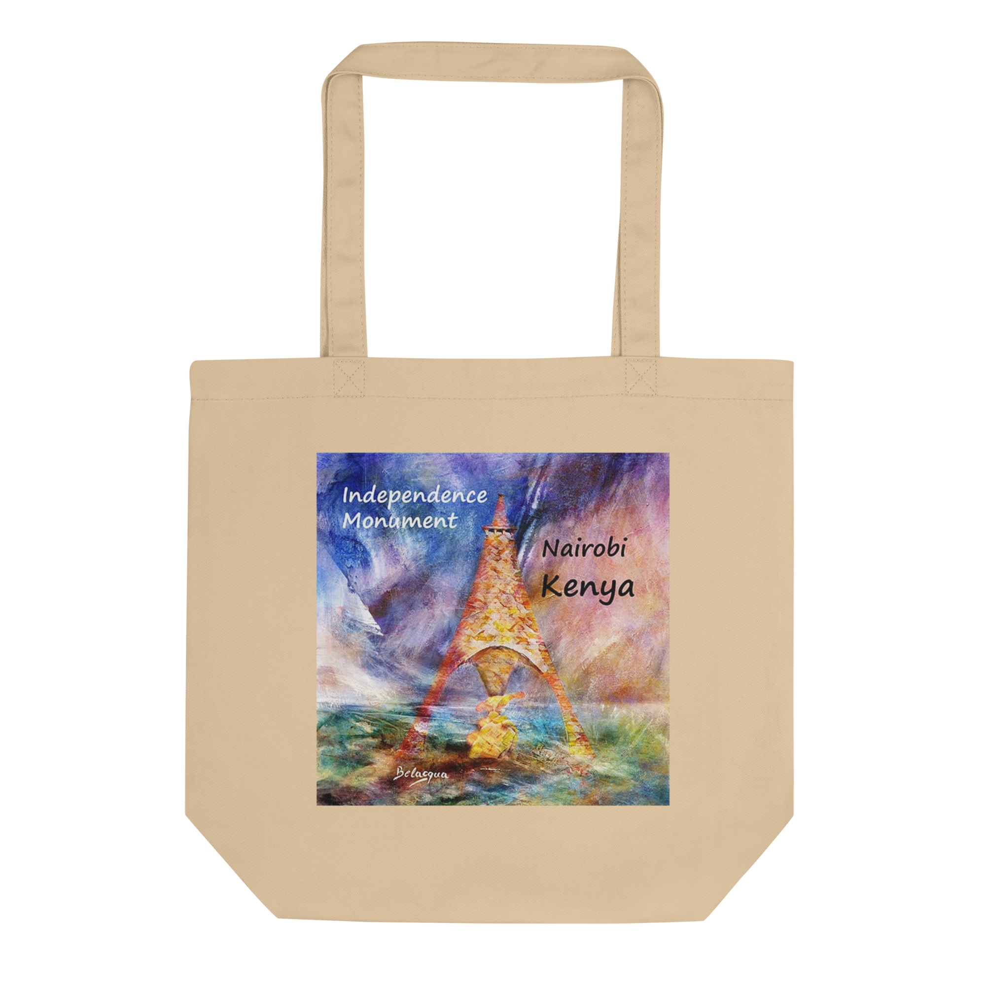 Uma sacola orgânica premium inspirada em Independence Monument Nairobi Kenya, reinterpretada pela visão artística de Belaqua. Criada para uso diário, combina utilidade, identidade cultural e design colecionável.