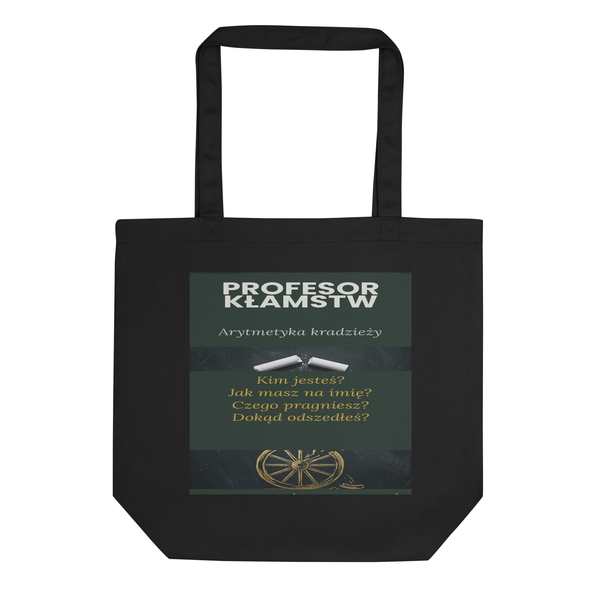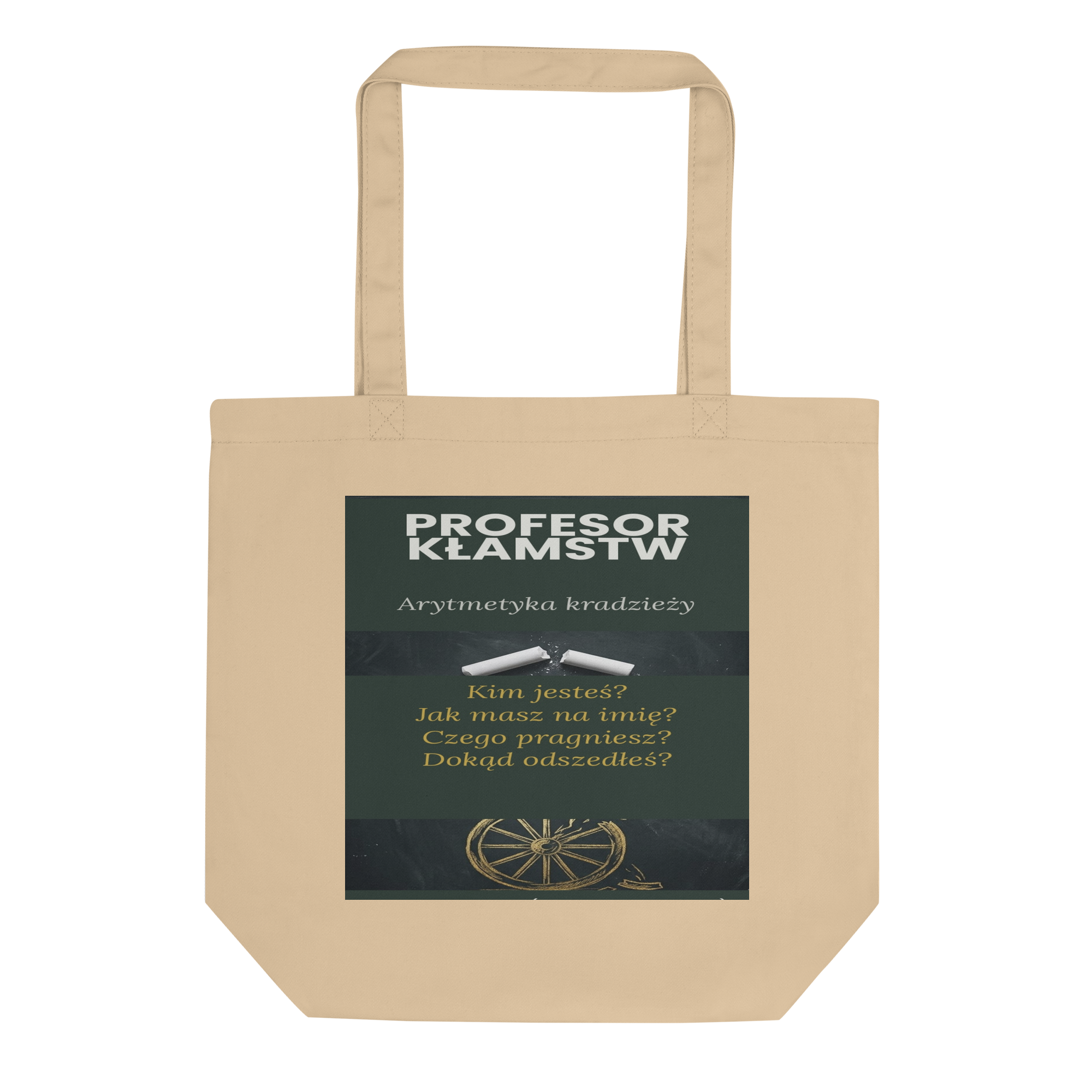 Uma sacola orgânica premium inspirada na capa da edição em polaco de Profesor Kłamstw – Arytmetyka kradzieży. Criada para uso diário, combina utilidade, identidade literária e design colecionável.